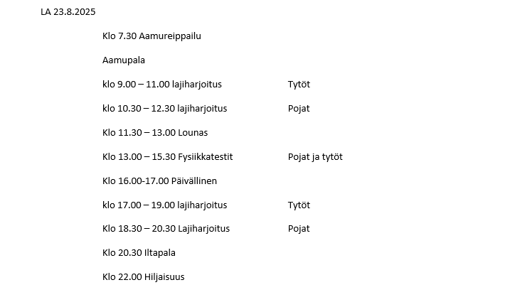 – Riittävästi treenikamppeita & alusvaatteita (Treenejä 6 kpl / sukupuoli)
