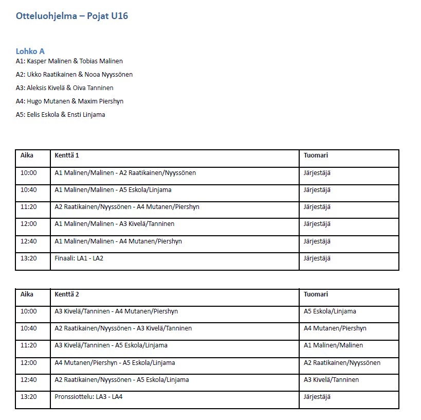 Viesti: U16 turnaus, tytöt/pojat, Ilmoittautuneiden nimet