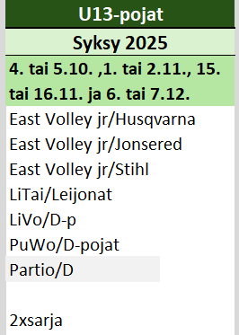 - Idän U13-U11-tyttöjen sarjoissa saa pelata yksi poika/joukkue/erä, jos pojille ei ole omaa joukkuetta, jossa pelata. Joukkueessa voi siis olla useampi poika, mutta he saavat pelata eräkohtaisesti.