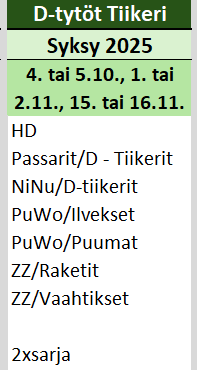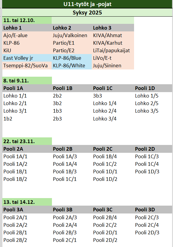 Sarjat jatkuvat keväällä. Uusia joukkueita kevääksi voi ilmoittaa 1.-15.12. välisenä aikana, ohjeet löytyvät lentopalloliiton ohjeet-sivulta. Sarjaa voi vaihtaa (esim. Tiikerisarjasta aluesarjaan) ilmoittamalla siitä sarjanhoitajalle viimeistään 15.12.