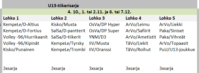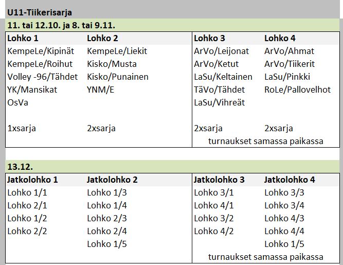 Sarjat jatkuvat keväällä. Uusia joukkueita kevääksi voi ilmoittaa 1.-15.12. välisenä aikana, ohjeet löytyvät lentopalloliiton ohjeet-sivulta. Sarjaa voi vaihtaa (esim. Tiikerisarjasta aluesarjaan) ilmoittamalla siitä sarjanhoitajalle viimeistään 15.12.